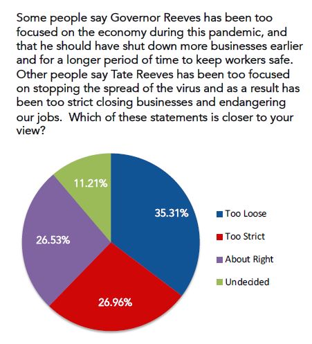 Nearly 72% agree that Governor Reeves is trying to make decisions to protect physical and economic health, rejecting his critics in the national media. As for whether the Governor’s actions have been too strict or too loose in terms of sheltering in place order or business closures, 35% say the actions were too loose, 27% view them as too strict, and nearly 27% say it has been about right.