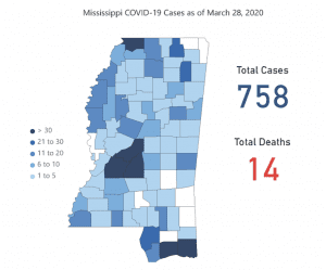 As of Sunday evening, 14 people in Mississippi had died of Coronavirus and 758 tested positive. 95 new cases were reported on the 29th. State Health Director, Dr. Dobbs warned the public last week that the next two weeks would prove to show a dramatic increase in cases of the virus.