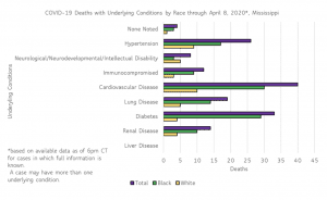 The majority of ethnicities still succumbing to the virus and dying are African Americans at 67% with Caucasian individuals at 33%. Based on the charts it looks that then 10 to 15 people have died from the virus with no known underlying illness. The rest, have all reported some type of ailment from liver disease to hypertension, to obesity.